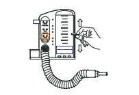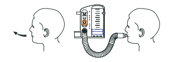 3. Медленно и глубоко вдохните, удерживая прибор в вертикальном положении, при этом шарик индикатора потока должен находиться в положении «смайлик». Вдохните как можно глубже. Когда вы больше не сможете вдыхать, задержите дыхание на несколько секунд и проверьте, до какой высоты поднялся поршень. Постарайтесь достичь заданного целевого уровня. Повторите процедуру заданное количество раз. Запишите результаты на листе учета пользователя.